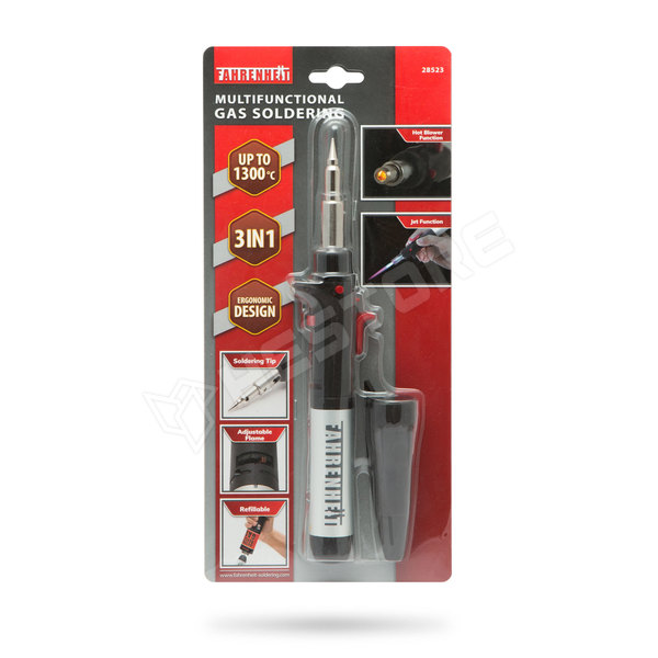 Felhasználható különböző finomelektronikai forrasztások, hőlégfúvás, zsugorítás (zsugorcső), szúrólánggal történő hevítés munkálatokhoz. Ez a kompakt készülék rengeteg hasznos funkcióval rendelkezik: biztonsági kapcsoló, lángszabályzó, folyamatos láng kapcsoló, lángkioltó gomb, piezo gyújtórendszer. A forrasztópáka-hegy lecsavarásával használhatjuk hőlégfúvóként is. A gáztartály újratölthető ezáltal a készülék hosszú időn át használható.