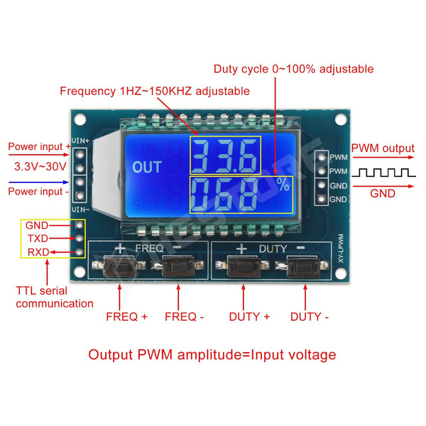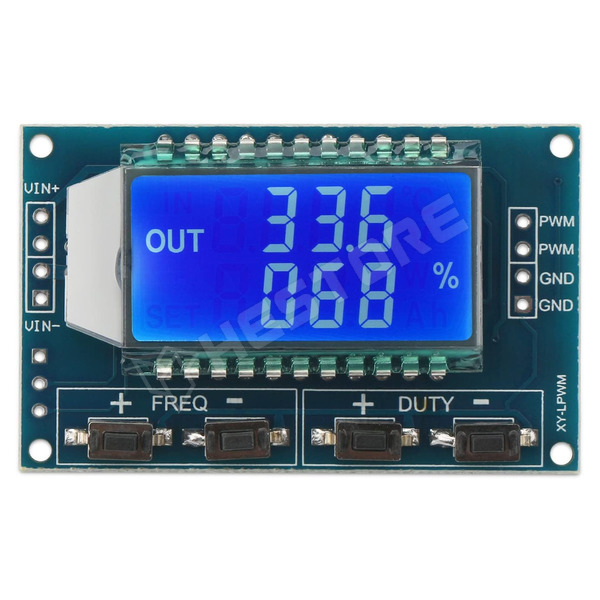 A modul 4 független gombbal rendelkezik, amelyek a frekvencia és a kitöltési tényező beállítására szolgálnak. Támogatja a rövid megnyomást (egy egység növeléséhez vagy csökkentéséhez) és hosszú megnyomását (gyors növeléséhez vagy csökkentéséhez). A beállítás után a paraméterek automatikusan mentésre kerülnek, és áramkimaradás esetén sem vesznek el.