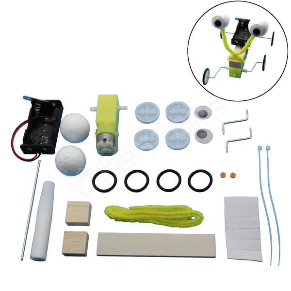 Ebből a készletből egy elemekkel meghajtott, DC motorral működő gülüszemű kúszó-mászó robotot építhetsz.