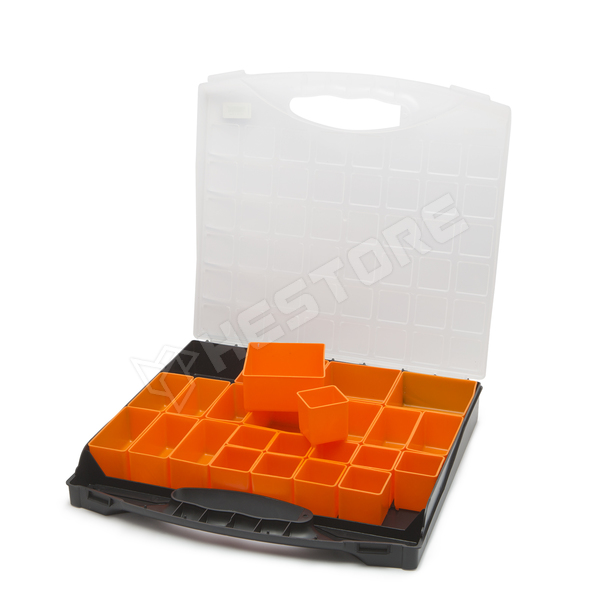- 10 db 4.5 x 4.5 cm, 9 db 9.5 x 4.5 cm és 5 db 9.5 x 9.5 cm narancs színű kivehető, variálható elrendezésű tárolódoboz