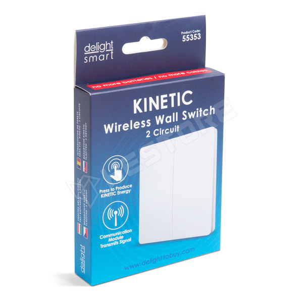 A Delight márka legújabb vezeték nélküli, KINETIC kapcsolócsaládjának fali kapcsolója, amely kábelek és elemek nélkül használható, ezáltal könnyen kapcsolhatóvá válik a vezérlőhöz csatlakoztatott fogyasztó. A termék használatához a Delight kínálatában megtalálható H55356 vagy H55357 vezérlőegység valamelyikének megvásárlása is szükséges! Az egységenkénti vásárlás lehetővé teszi a moduláris felépítést, így mindenki a saját igényeinek megfelelő kapcsolóhálózatot hozhatja létre.