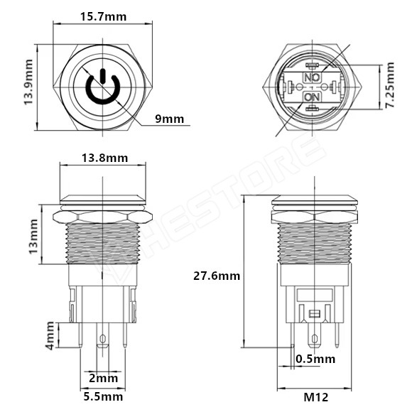 Vandálbiztos nyomókapcsoló, Ø12mm, 12...24V AC/DC piros LED power szimbólum, SPST, OFF-ON, 2 stabil pozíció, IP65