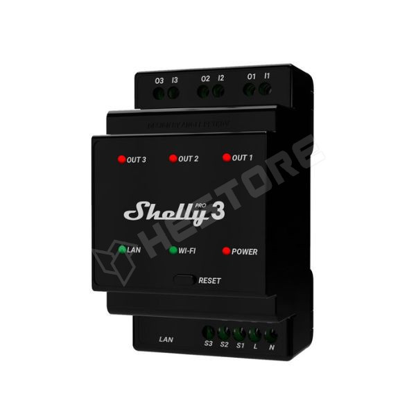 A Shelly PRO3 a villamossági szekrény DIN-sínre szerelhető legújabb Shelly PRO termékgeneráció 3 áramkörös tagja, WiFi + LAN kapcsolatra képes. Bluetooth segítségével párosítható a telefonnal. Három független relével rendelkezik, váltóram és egyenáram kapcsolására és feszültségmentes kapcsolásra is képes. A Shelly relék között egyedüliként három különböző fázis kapcsolására is képes a 3 áramköre.